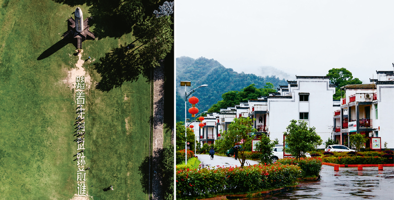 2018年7月29日,瑞金市率先在赣南脱贫摘帽,“共和国摇篮”在全面建成小康社会道路上迈出关键一步。左图为2018年7月21日拍摄的江西瑞金市红军烈士纪念塔的鸟瞰图(黄龙/摄)。右图为2019年5月6日拍摄的华屋村新貌(新华社记者 兰红光/摄)。华屋村位于江西瑞金市叶坪乡,是远近闻名的“红军村”。