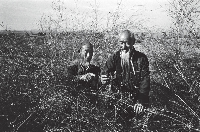 上世纪80年代,甘肃省古浪县石满、贺发林等6位花甲老人,卷起铺盖在地处腾格里沙漠南缘的八步沙安营扎寨,治沙造林数十年如一日,终使沙丘披绿装。图为石满(左)、贺发林(右)在检查花棒病虫害。 新华社记者 李生才/摄
