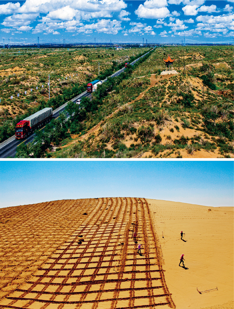 八步沙人坚信,“今天种活一棵树,明天就会种活千万棵树”,他们以三代人的接续奋斗终将不毛之地变成了绿色家园。上图为沙漠治理后,公路、铁路得到有效保护(中共古浪县委宣传部供图)。下图为八步沙草方格压沙现场(八步沙林场供图)。