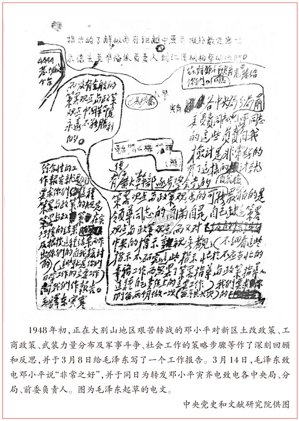当年3月14日,毛泽东在收到邓小平3月8日关于新解放区全盘的策略与政策问题给中共中央的报告后,批示向各中央局、分局、前委转发邓小平的报告,批语中给予报告高度评价,同时指出:“要求你们每两个月做一次(每年共六次)的综合性的工作报告,就是要求你们将这种策略与政策的规定、策略与政策在实行后的结果及根据这种结果而作出的你们的自我检讨(这些就是你们日常工作的主要工作)向我们作报告。”