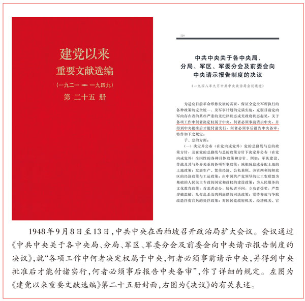 同年9月,毛泽东在西柏坡主持召开中共中央政治局会议,会议通过了《中共中央关于各中央局、分局、军区、军委分会及前委会向中央请示报告制度的决议》(简称《决议》)。《决议》就各项工作中何者决定权属于中央,何者必须事前请示中央,并得到中央批准后才能付诸实行,何者必须事后报告中央备审,作了详细的规定,从而正式确立了包括综合报告和其他各项工作报告在内的一整套完备的请示报告制度,同时也明确了党的各级组织的权限和责任担当。