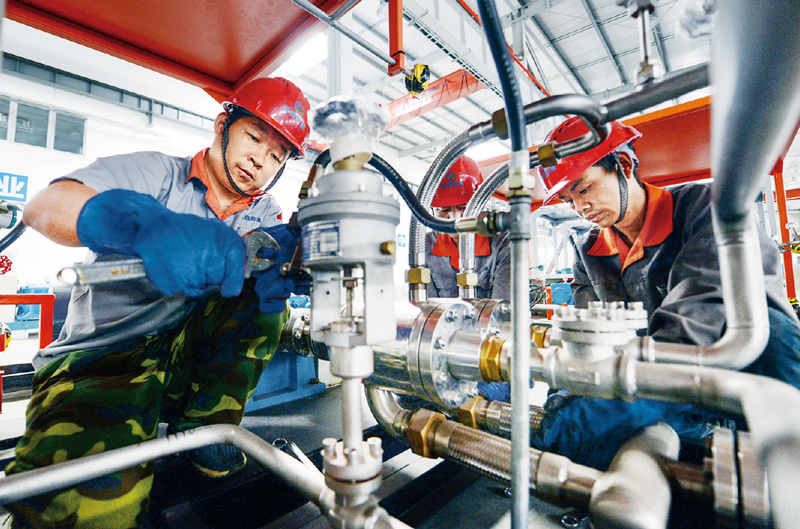 浙江全面实施科技新政,加快建设创新强省。浙江台连低温科技有限公司是位于湖州市的一家企业,该企业与北京航天101所签订联合研发协议,并在航天院成立研发中心,依靠出色的生产质量和服务质量逐渐打响品牌,赢得国内外市场。图为2019年9月16日,该公司工作人员正在进行生产操作。 人民图片 陆一平/摄