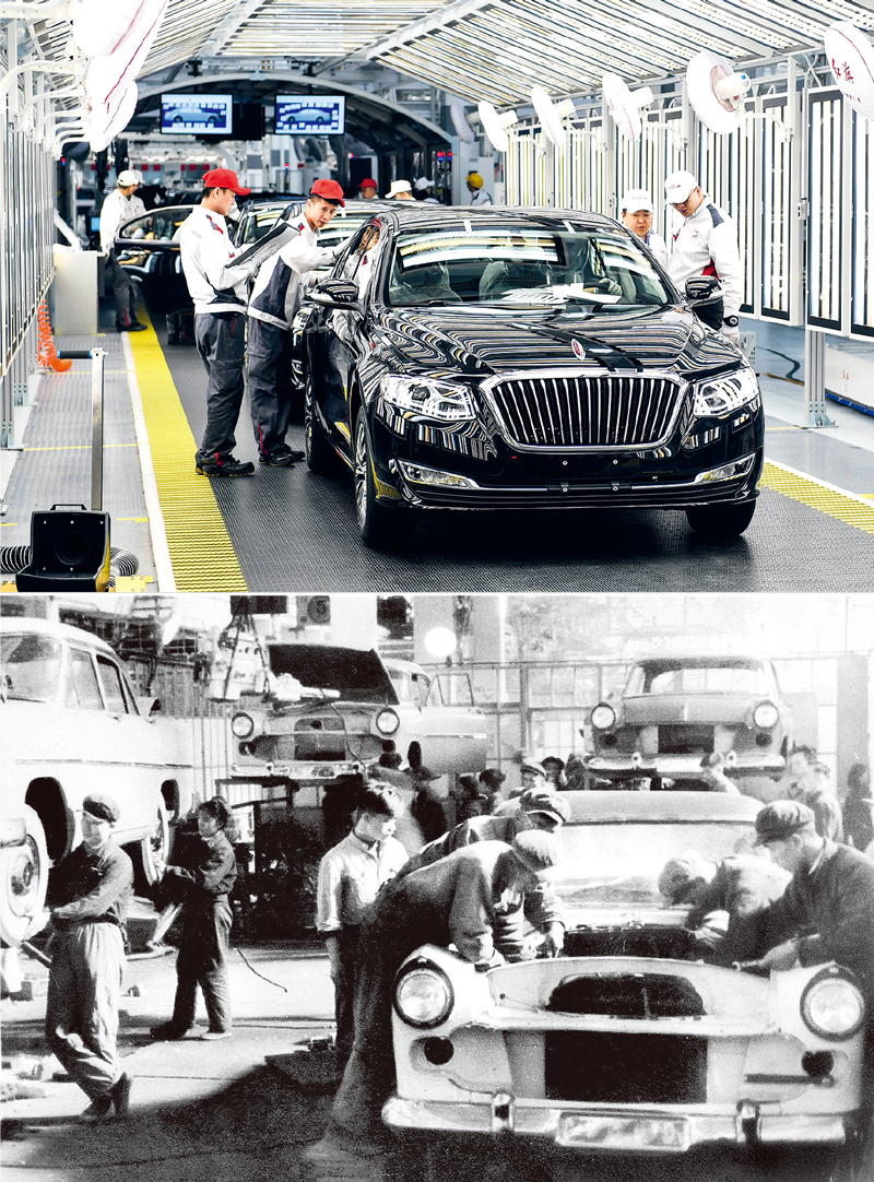 1958年,第一辆“红旗”牌轿车研制成功,写下新中国工业发展新的注脚。今天的中国,拥有联合国产业分类中全部工业门类,汽车等200多种工业品产量居世界第一,已成为全球制造业第一大国。上图为2019年4月9日,在一汽红旗总装车间内,职工在对生产的红旗轿车进行静检作业(新华社记者 许畅/摄);下图为1958年拍摄的第一汽车制造厂,这里生产了第一批红旗轿车(资料照片)。