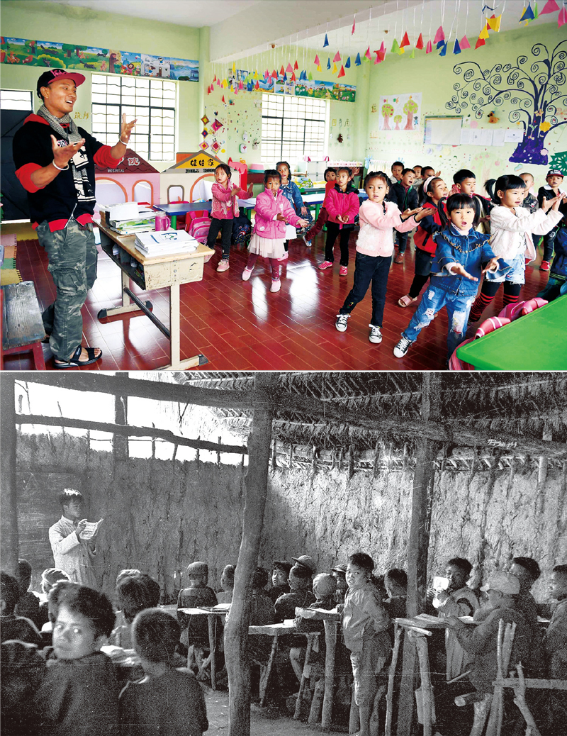 教育是民族振兴、社会进步的重要基石。70年来,新中国从成立初期80%以上人口是文盲,到2018年九年义务教育巩固率达94.2%,人民群众在教育方面的获得感日益增强。上图为2018年12月7日,云南省普洱市西盟佤族自治县勐梭镇班母村佤山育忠幼儿园的孩子跟着老师上音乐课(新华社记者 杨宗友/摄);下图为1954年,在云南省普洱市西盟佤族自治县创办的第一所小学——西盟小学,老师带领孩子读书学习(资料照片)。
