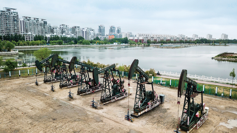 经过半个多世纪艰苦创业,大庆油田不仅扛起了“共和国加油机”的神圣职责,为保障国家能源安全作出巨大贡献,而且着力打造了一座人与自然和谐相处、原油生产与环境保护相得益彰的“绿色油化之都”。图为大庆油田丛式井坐落在市区燕都湖旁。 新华社记者 王建威/摄