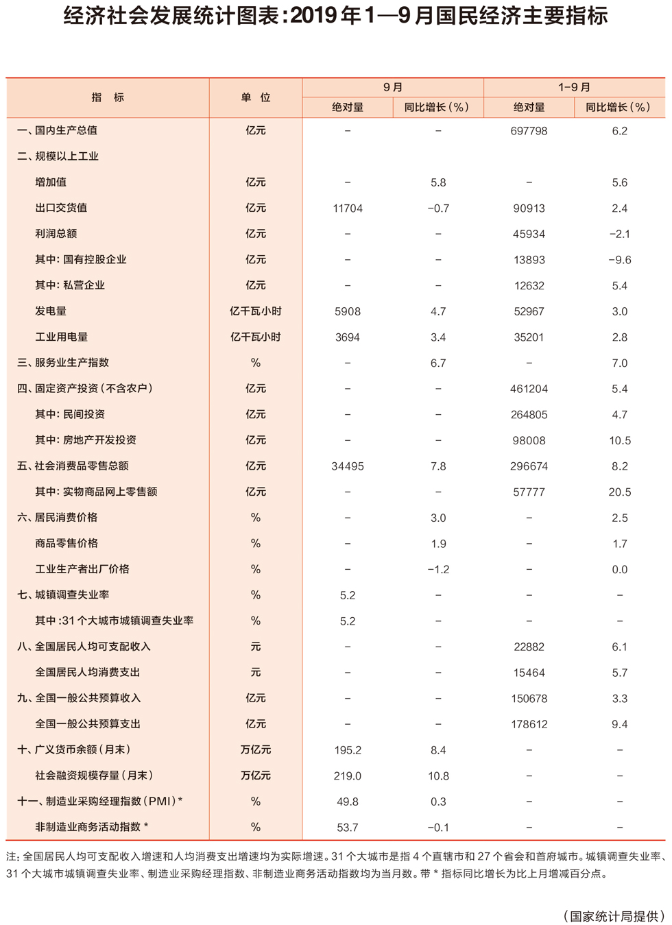 经济社会发展统计图表:2019年1—9月国民经济主要指标