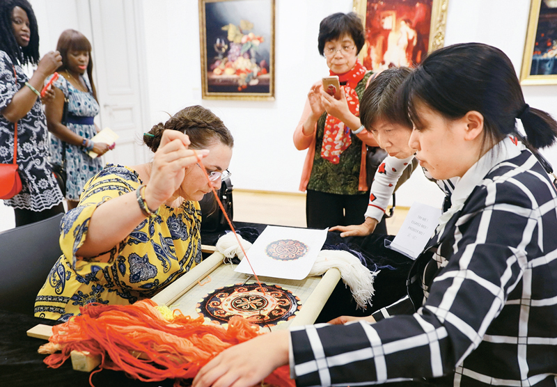 2019年7月4日,《“绣”里乾坤·上海绒绣欧洲交流展》在比利时布鲁塞尔中国文化中心开幕。展览首次将上海绒绣带给欧洲观众,使其能零距离接触绒绣艺术,并透过绒绣技艺的发展体会文明的交融与互鉴。图为观众现场体验绒绣技艺。 新华社记者 潘革平/摄