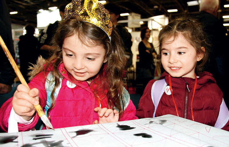 2019年3月15日,第39届巴黎图书沙龙在法国巴黎凡尔赛门展览中心举行,500余种、900多册中国图书亮相其中。来自北京、上海、江西、浙江等省市的18家出版单位参加本届巴黎图书沙龙,参展图书包括传统文化、汉语学习、少儿读物、中国文学、人文社科、科学技术等多种类型。图为一名女孩在巴黎图书沙龙中国展区体验中国书法。 新华社记者 杨一苗/摄