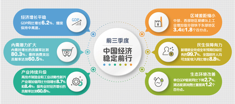 一是经济增长总体平稳。灵活运用宏观政策逆周期调节工具,积极的财政政策进一步加力提效,实施大规模减税降费举措,加大对民生等重点领域的财政支出保障力度。稳健的货币政策适时预调微调,今年三次下调存款准备金率,加大对实体经济信贷投放力度,用改革的办法引导市场利率下行,有力促进了经济稳定增长。前三季度,国内生产总值同比增长6.2%,在较高基数上继续保持中高速增长,为实现全年经济增长预期目标奠定了扎实基础。比较分析表明,我国经济增速在总量1万亿美元以上的世界经济体中位居第一,继续成为推动世界经济增长的重要引擎。
