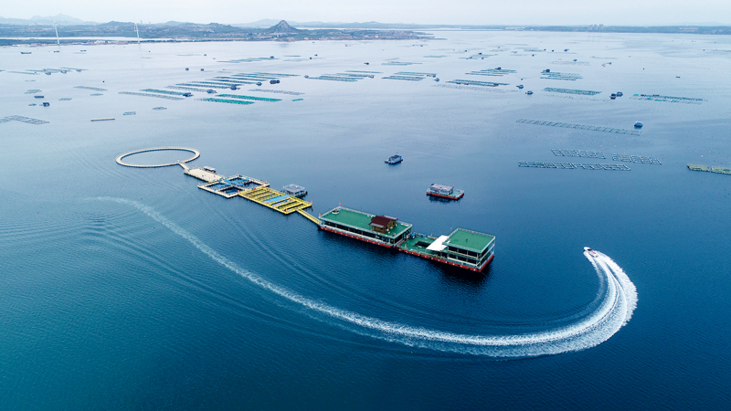 我国经济发展韧性强、潜力大、回旋余地广,长期向好基础牢、条件好。山东省荣成市作为国家级海洋经济发展示范区建设主战场,积极启动开发区体制机制改革,助推海洋经济高质量发展。图为2019年8月27日,荣成市桑沟湾泓泰海洋牧场海上观光平台,一艘救生艇正在巡逻。 人民图片 杨志礼/摄