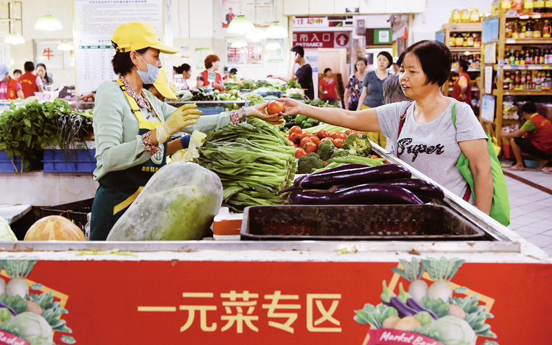 “菜篮子”涉及千家万户,是保障和改善民生的重要内容。图为2019年9月11日,在海口市金贸文华农贸市场,市民在“菜篮子”平价菜直营摊位选购蔬菜。 新华社记者 杨冠宇/摄