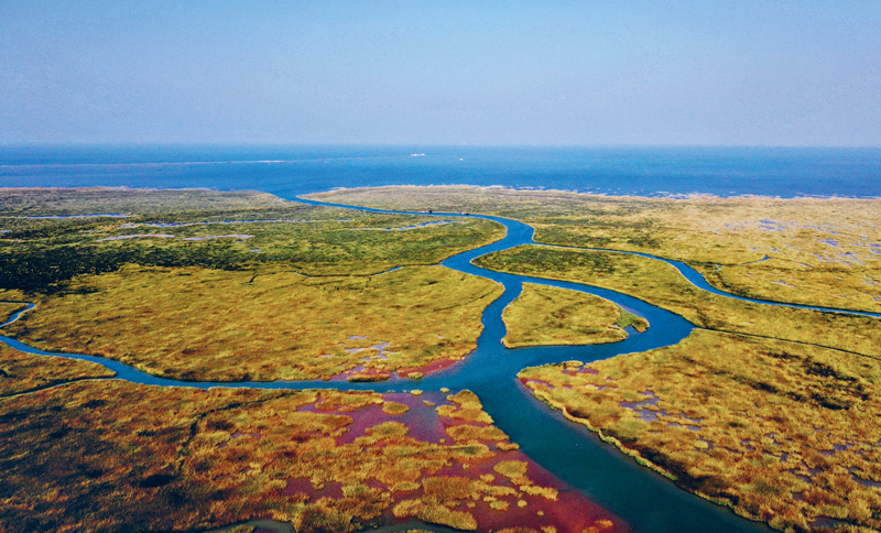 在黄河入海口,滔滔黄河水与渤海激情交汇,孕育了世界上最年轻的大河三角洲湿地生态系统。经过多年的生态调水和保护治理,植被退化的现象得到遏制,植被的结构组成和覆盖季显著增加,已成为中国沿海地区最大的海滩自然植被区之一。 图为2019年10月拍摄的黄河三角洲湿地一景。 山东省委宣传部供图 杨斌/摄