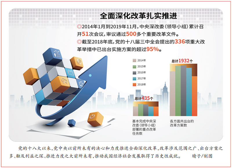 坚持改革创新、与时俱进,善于自我完善、自我发展,使社会始终充满生机活力,是我国国家制度和国家治理体系的一个显著优势。党的十八大以来,中国改革风起云涌,各项创新层出不穷。中央全面深化改革委员会(领导小组)已审议通过500多个重要改革文件,各地各部门也推出数千项改革举措,有力调动了各方面积极性,推动我国经济社会发展取得了历史性成就。