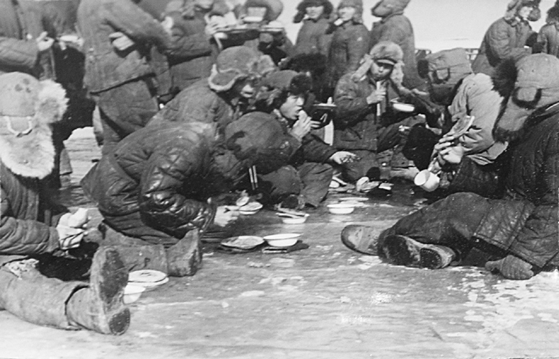 1959年大庆油田发现后,石油部决定组织石油会战。在党中央支持下,全国各地石油职工和3万多名解放军转业官兵及大专院校学生,从四面八方云集大庆,投入了这场石油会战。会战初期,生产生活条件十分艰苦。图为当时职工“五两粮食保三餐”坚持会战的场景。 大庆油田供图