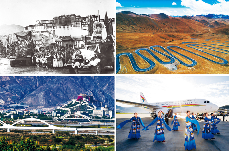 民族区域自治制度在西藏的伟大实践,使西藏实现了经济社会发展短短几十年、跨越上千年的历史性巨变。左上图:1954年12月25日,川藏、青藏两条公路胜利通车到拉萨,在布达拉宫广场上举行盛大通车仪式(资料照片)。左下图:2016年6月27日,青藏铁路列车经过拉萨(新华社记者 普布扎西/摄)。右上图:2017年5月19日,通往珠峰的公路(新华社记者 普布扎西/摄)。右下图:2011年7月26日,西藏航空有限公司正式开航(新华社记者 觉果/摄)。