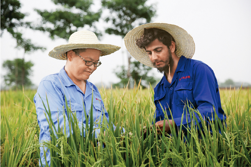 中国在打赢脱贫攻坚战过程中始终致力于同世界各国一道,携手推进国际减贫进程,合力建设远离贫困、共享繁荣的美好世界。图为2019年7月10日,在巴基斯坦东部旁遮普省首府拉合尔西南郊,来自中国的农业专家(左)同当地技术人员在稻田里进行杂交水稻选种试验。中国专家“希望带动更多的巴基斯坦人创造出更多的杂交水稻品种,让更多人吃饱饭”。 新华社记者 蒋超/摄