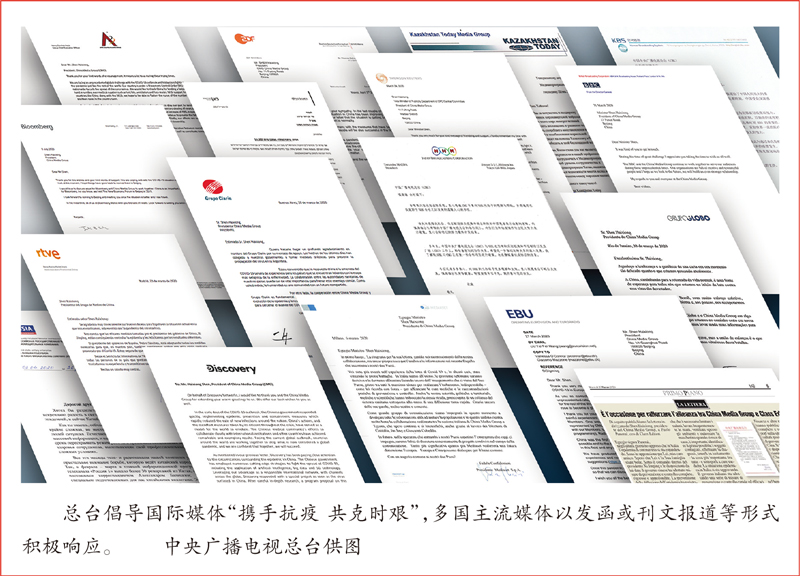 携手抗疫、共克时艰,向国际同行发出中国媒体最强音。疫情发生后,习近平总书记与各国元首、各国际组织负责人等频密沟通、深化共识,以务实高效的方式有力推动国际合作。我们紧紧跟随习近平总书记外交步伐,积极探索创新媒体公共外交方式方法,以文会友、主动作为,投桃报李、广结善缘。1月底至3月初,总台先后收到104家国际主流媒体和全球5家主要媒体组织负责人的慰问信,总台负责人逐一复函致谢,并倡导国际媒体同行及时、客观、全面地报道中国的疫情形势及中国抗疫的巨大努力和积极成效。随着疫情在境外扩散蔓延,3月上旬至6月底,总台向112家国际媒体机构负责人和32个国家驻华大使发去慰问函,介绍中国政府积极开展抗疫国际合作的立场和行动,呼吁国际媒体加强合作、同向发力,为战胜疫情做出负责任媒体应有的努力和贡献。路透社、法新社、全俄广播电视公司、英国广播公司、韩国放送公社、日本广播协会等媒体同行纷纷以发函或刊文报道等形式积极回应,肯定中国在抗击疫情中的国际合作和大国担当,赞赏总台作为国际主流媒体的责任和作用,并表示愿意以此为契机与总台加强包括抗疫报道在内的多领域合作。