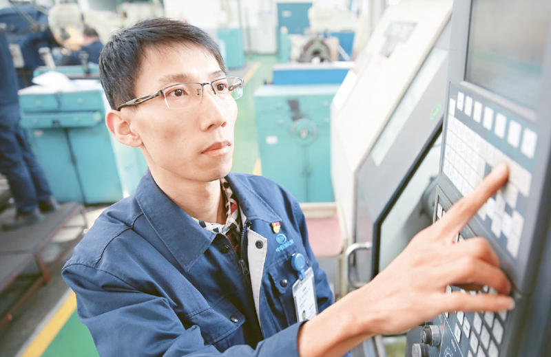 图为洪家光正在操作机床,加工重要航空产品关键工装。 牟鹏宇/摄