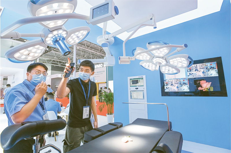 数字技术极大拓展人们的生活半径,深度融入群众生产生活的方方面面,在便利城乡居民生活、优化公共服务能力水平、促进脱贫攻坚事业发展等方面提供了有力支撑。图为2020年9月19日,在广东深圳举行的第21届全国医院建设大会暨中国国际医院建设、装备及管理展览会上,观众了解数字一体化手术室设备。 新华社记者 刘大伟/摄