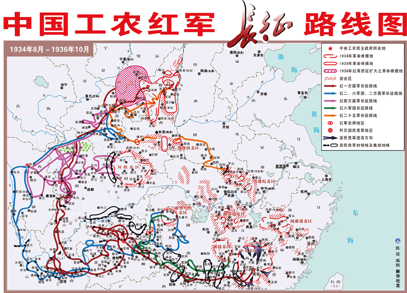 长征这一惊天动地的革命壮举,是中国共产党和红军谱写的壮丽史诗,是中华民族伟大复兴历史进程中的巍峨丰碑。这是中国工农红军长征路线图。 新华社发