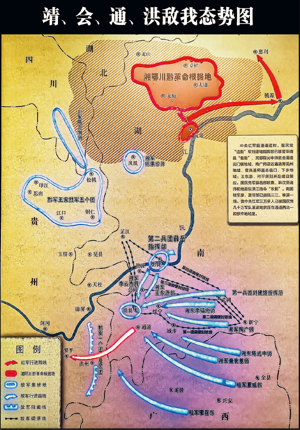 12月13日,中央红军在通道境内分两路转兵西进。这次在危急关口紧急调整进军方向,使红军避开敌人重兵包围圈的重大军事转移,史称“通道转兵”。“正是在这危急关头,毛主席挽救了红军……当时,如果不是毛主席坚决主张改变方针,所剩三万多红军的前途只有毁灭。”刘伯承同志在《回顾长征》一文中这样写道。