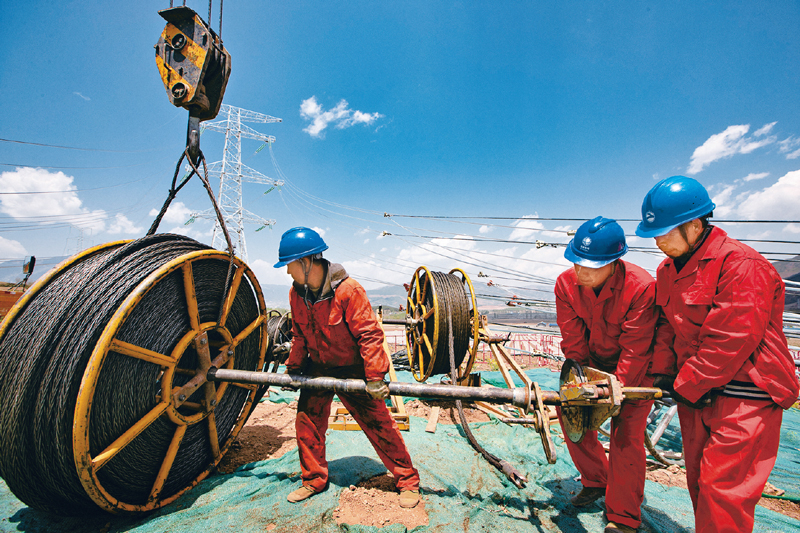 加快构建新发展格局,必须增强城乡区域发展协调性,优化国内大循环的空间布局。图为2021年4月14日,四川凉山州白鹤滩水电站送出工程,国网四川电力送变电建设有限公司员工在500千伏ABN100号塔处牵引场施工作业。 人民图片 田海/摄