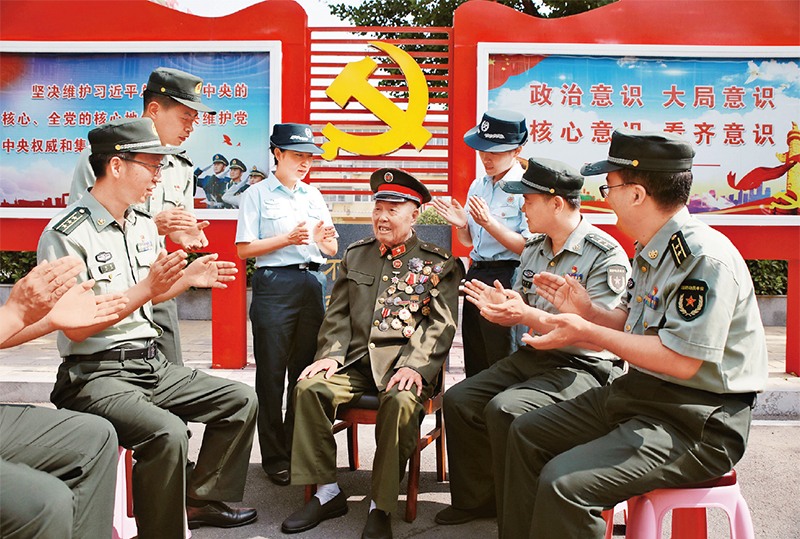 图为2021年6月11日,王占山(中)给河南省军区安阳干休所官兵和文职人员讲党课。 新华社发 戴丹华/摄