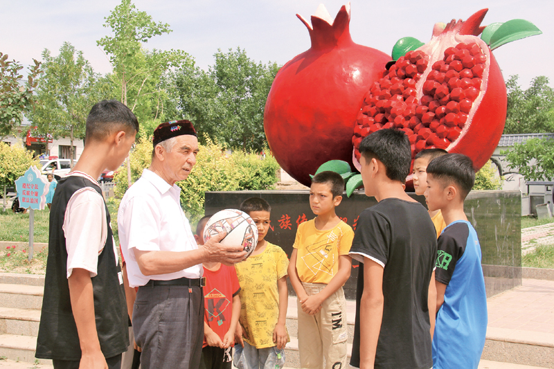 图为2021年7月8日买买提江·吾买尔与布力开村青少年交流,勉励他们好好学习、立志成才、报效祖国。 吴志坚/摄
