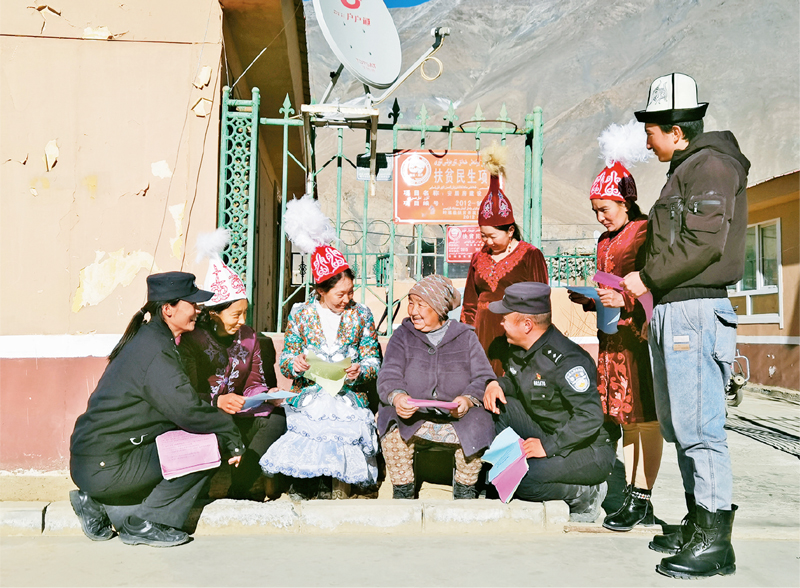 为打通党的十九届六中全会精神宣讲“最后一公里”,新疆喀什边境管理支队库地边境派出所组织民警深入辖区抵边村落、农牧民夜校、施工作业点等进行宣讲。图为2021年12月10日,民警前往距离叶城县将近300公里的苦鲁勒村,在家门口向村民们宣讲全会精神。 人民视觉 李展朋/摄