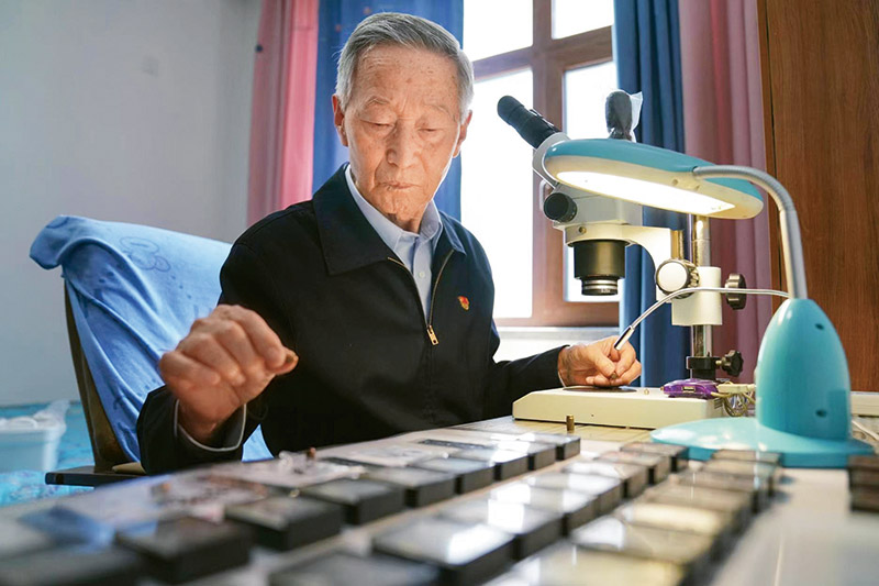 图为2021年6月8日,崔道植在哈尔滨市老年公寓房间中进行痕迹检验实验。 新华社记者 王松/摄