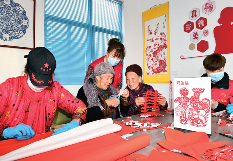 山东省日照市岚山区按照就近、普惠原则建设养老服务中心,并组建志愿服务队为老人提供助餐、助洁、助医等爱心服务。图为2022年2月27日,志愿者在日照市岚山区虎山镇黄家峪村养老服务中心陪老人剪纸、聊天。 新华社记者 郭绪雷/摄