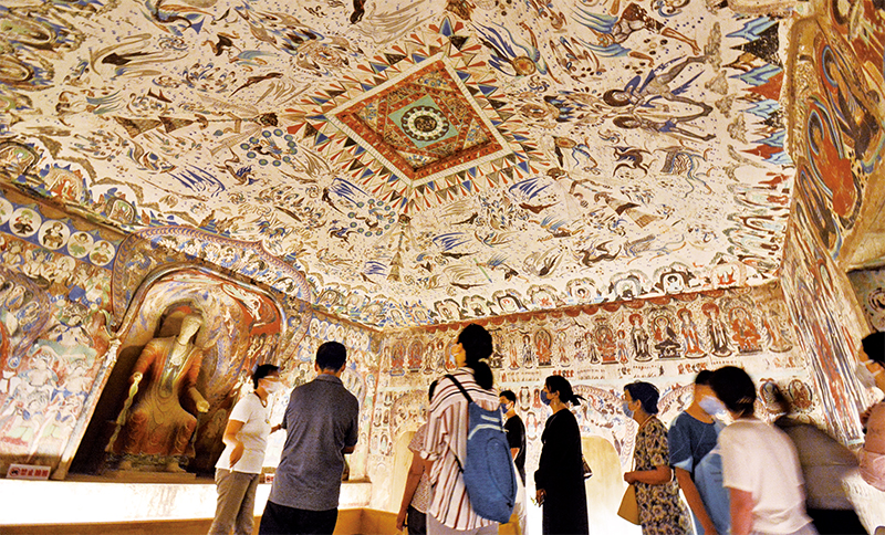 日前,由敦煌研究院、国家对外文化贸易基地主办的“丝绸之路上的敦煌——数字敦煌展”在北京开幕。图为2022年7月10日,观众参观用数字技术复制的等比例敦煌第285窟。 新华社记者 李欣/摄