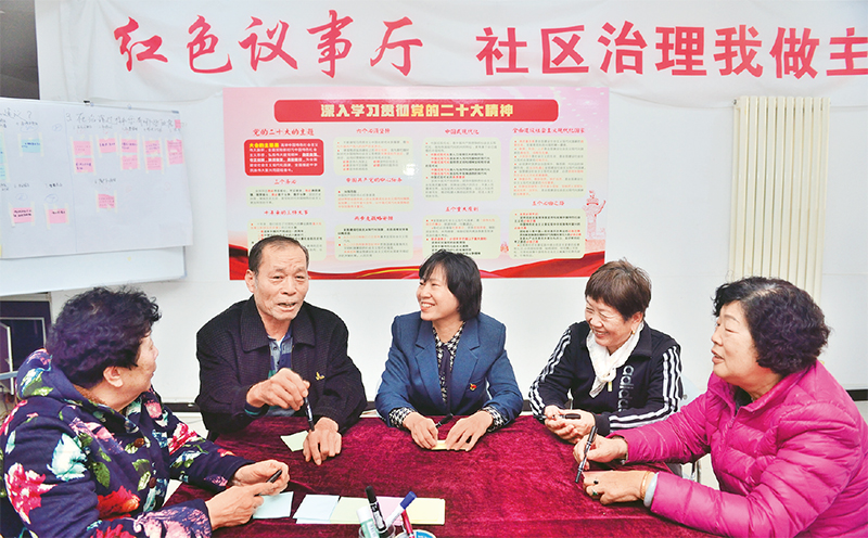 天津市河西区越秀路街道港云里社区深入学习贯彻党的二十大精神,努力打造居民共建共治共享的基层治理新格局。图为2022年11月23日,社区居民在“红色议事厅”讨论优化社区治理事宜。 天津日报记者 胡凌云/摄