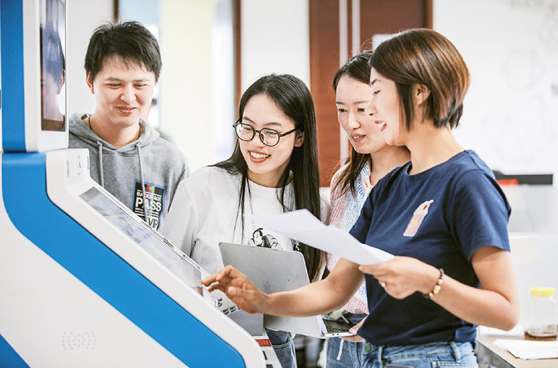 近年来,福建省福州市依托政务数据共享,通过自助终端设备整合多部门服务事项,实现24小时自助服务,打造“15分钟便民服务圈”。图为2022年10月24日,福州市一家企业工作人员对便民自助终端进行产品软件测试。 人民图片 谢贵明/摄
