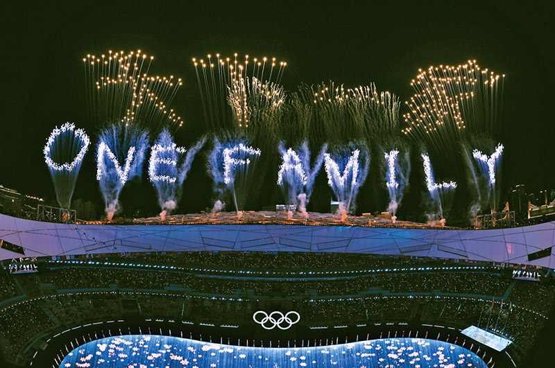 在世界百年变局加速演进、人类社会遭遇各种挑战的形势下,奥林匹克大家庭成员不远万里来华共襄盛举,“一起向未来”和“更团结”相互呼应,北京冬奥会、冬残奥会成为了一场和平友谊的盛会、一场团结合作的盛会、一场鼓舞世界的盛会。图为2022年2月20日,北京第二十四届冬季奥林匹克运动会闭幕式上的焰火在“鸟巢”上空显示出中文“天下一家”和英文“ONE FAMILY”字样。 新华社记者 宋彦桦/摄