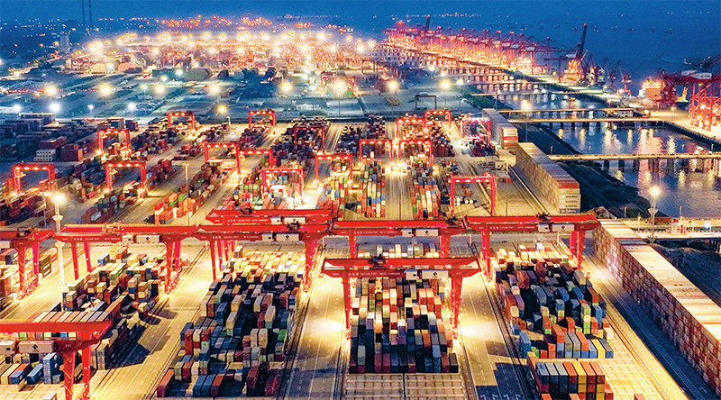 港口是高水平对外开放的窗口。图为2022年11月5日,江苏太仓港集装箱码头灯火通明。2022年1月至10月,江苏太仓港累计完成集装箱吞吐量665万标箱,同比增长16.1%。 人民图片 袁新宇/摄