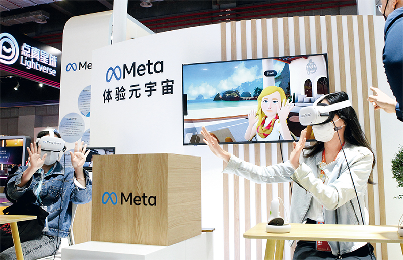 中国国际进口博览会连续举办5年,已经成为中国构建新发展格局的窗口、推动高水平开放的平台、全球共享的国际公共产品。图为2022年11月7日,在第五届进博会技术装备展区的人工智能专区,体验者借助VR头戴设备感受在虚拟工作空间“隔空击掌”。 新华社记者 侯俊/摄