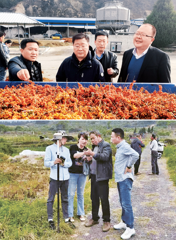 上图为邱军(右一)在甘农科技调研沙棘收购情况(中国化学工程集团有限公司供图);下图为孙丽美(左二)与同事开展征地测绘工作(福建省委宣传部供图)。