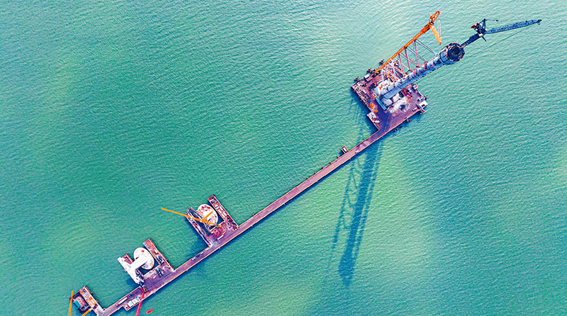 我国发挥财政稳投资促消费作用,强化政府投资对全社会投资的引导带动,促进恢复和扩大消费,着力扩大国内需求。图为2023年1月5日,在位于广东省珠海市高栏港经济区的黄茅海跨海通道建设现场,1座主塔和3个桥墩正拔地而起。 人民图片 魏劲松/摄