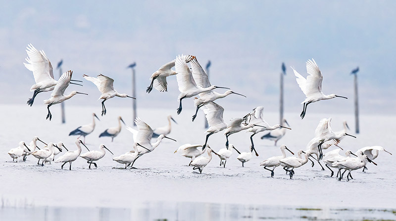近年来,江西省九江市湖口县持续加大财政对生态环境保护的投入力度,推进湿地修复与生物多样性保护工作,生态环境不断得到改善,为鸟类提供了良好的繁衍生存空间。图为2023年2月7日,成群越冬候鸟在鄱阳湖江西省九江市湖口县湿地嬉戏。 人民图片 张玉/摄