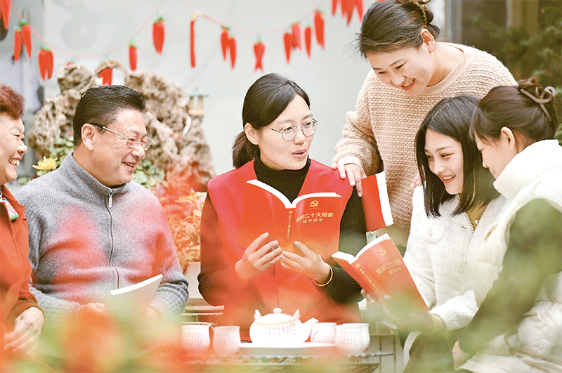 2022年11月17日,在山东省临沂市郯城县马头镇民主街,“巾帼宣讲团”成员为群众宣讲党的二十大精神。“巾帼宣讲团”成员由各社区、村街妇联干部担任,她们走进农家、田间宣讲党的二十大精神和国家取得的辉煌成就,进一步坚定广大干部群众“听党话、感党恩、跟党走”的信念。 全国妇联供图