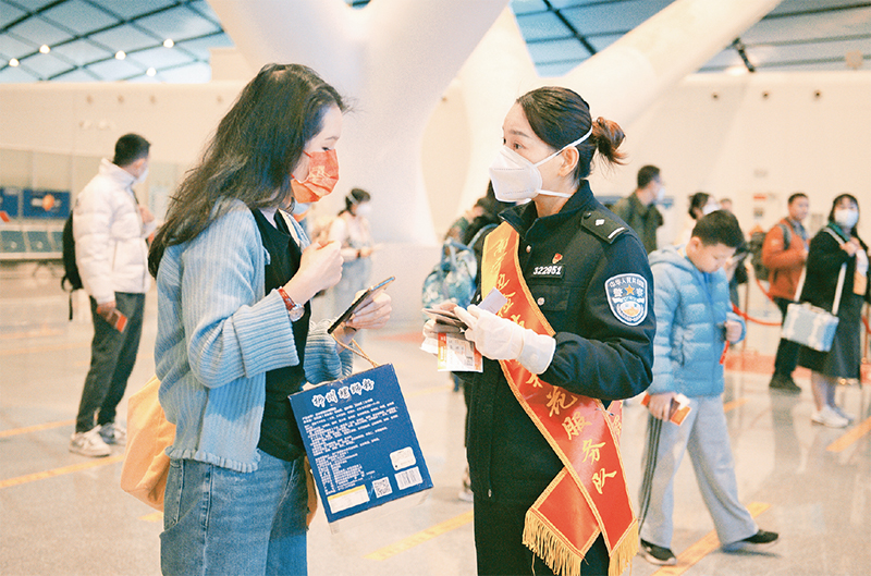 2023年2月6日,在广西南宁吴圩国际机场,全国三八红旗集体南宁边检站“朱槿花服务队”队员为旅客解答出入境相关问题。 全国妇联供图