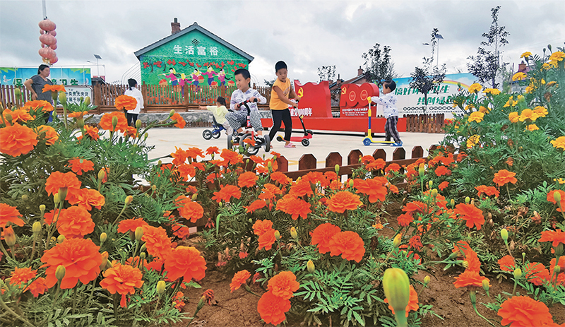 吉林省舒兰市小城镇本着“小景观撬动大民心”的宗旨,把建设广场、花坛、栅栏、门头、彩绘墙等群众受益更长效的小景观作为改造重点,使乡村面貌焕然一新,受到群众好评。图为2021年8月,花团锦簇、欢声笑语中的小城镇马路村一角。 吉林省委宣传部供图 丁研/摄
