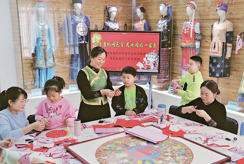 2023年2月3日,内蒙古赤峰市松山区兴安街道临潢家园社区在民族融合小课桌开展“巧手剪纸闹元宵”活动。 王婷/摄