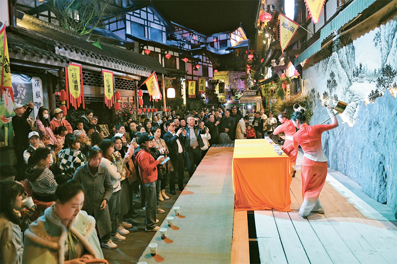 随着消费场景有序恢复、市场流通逐步改善、促消费政策落地显效,我国居民消费需求稳步释放,消费对经济增长贡献提高。图为2023年3月20日,游客在四川省阆中市南津关古镇观看《蜀道盛世》移动实景演出。 新华社记者 刘坤/摄
