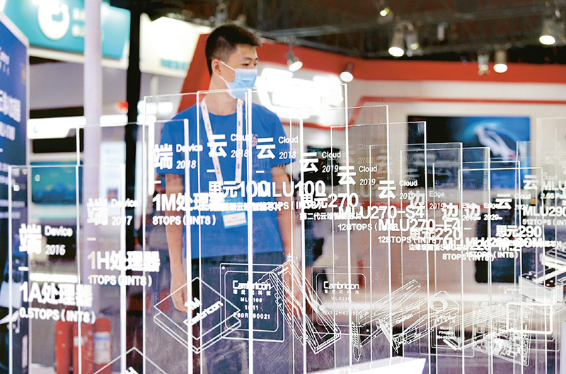 2022全球数字经济大会在北京召开,成为促进全球数字经济发展交流合作的新平台和展现北京具有全球影响力的数字经济建设成果的重要窗口。图为大会上参展企业寒武纪展示自主研发的各种型号云计算处理器。 北京日报记者 和冠欣/摄