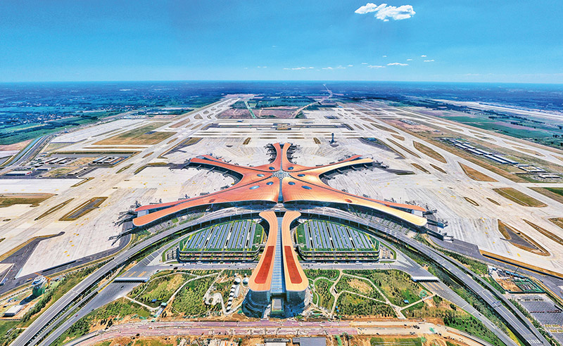 北京大兴国际机场于2019年9月正式投用,是全球最大单体航站楼、首都重大标志性工程、京津冀协同发展的重要成果,推动北京迈入航空“双枢纽”时代。图为俯瞰北京大兴国际机场。 北京日报记者 潘之望/摄