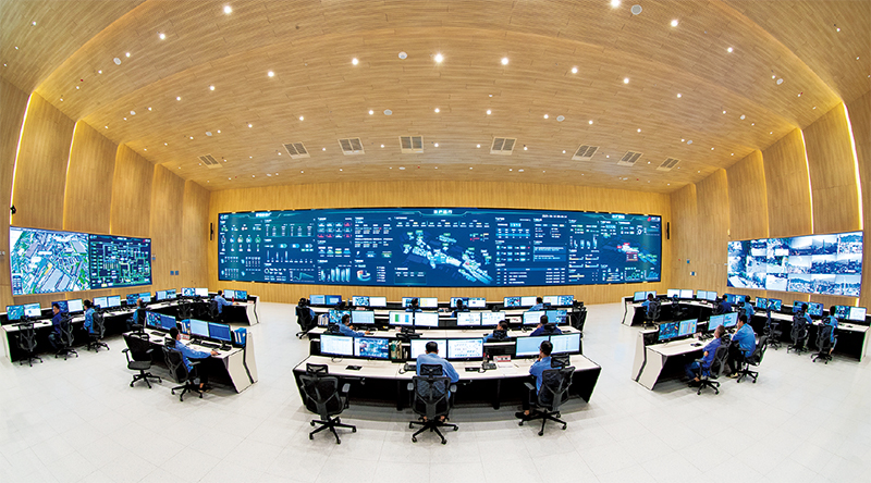 福建省三钢(集团)有限责任公司积极转型升级,计划投资95.1亿元发力产能提升、智能制造,预计运营成本降低20%以上、能源利用率提高10%以上。图为三钢闽光大数据中心管控中心大厅,值班员正在现场观测数据。 福建日报社供图