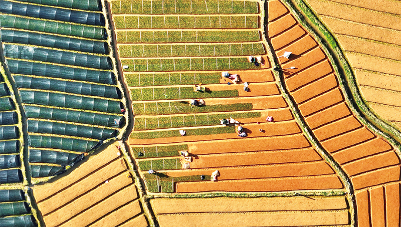 福建省宁德市甘棠镇发挥本地资源优势,大力发展茶苗良种繁育产业,年出圃茶苗达8亿多株,年产值2亿多元,带动就业超2万人,人均年收入超2.6万元。图为2023年2月15日,甘棠镇农户在茶圃育苗。 福建日报社供图