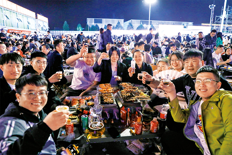 2023年“五一”假期期间,来自全国各地的游客纷纷前往山东淄博,品尝走红的“灵魂烧烤”。淄博市政府和市民积极采取措施为游客提供便利,如新增烧烤公交定制专线,规范住宿价格,商场和影院提供夜间休息服务等,温暖着每一名游客。图为2023年4月29日,游客在淄博市一家烧烤城吃烧烤。 新华社发 朱伟/摄